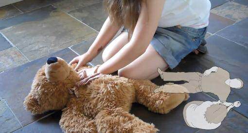 demonstrating saving her teddy bear from an