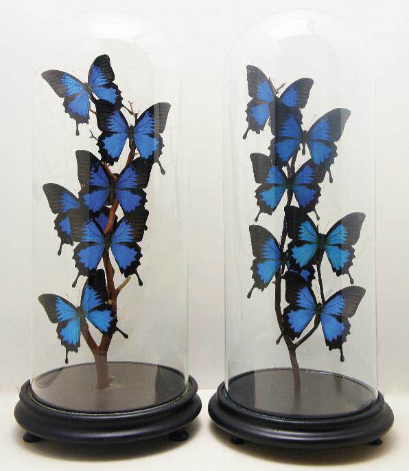 Collections of butterflies in antique glass domes made